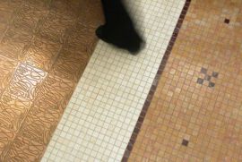 Sonderanfertigung im eleganten Fisch-Schuppen-Muster, ca. 70 m² kombiniert mit 140 m² industriell (ebenfalls als Sonderanfertigung) hergestelltem Mosaik aus giallo reale, rosso levanto und bianco perlino