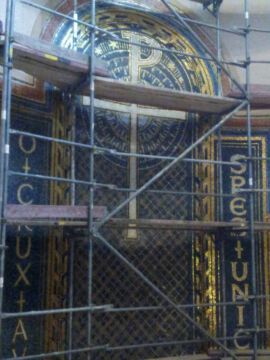 Bei der Umgestaltung der Kirche in den 60er Jahren wurde das "P" entfernt und durch Smalten ergänzt. Zum Teil wurden die Smalten dann mit Farbe bemalt um sie farblich anzupassen.