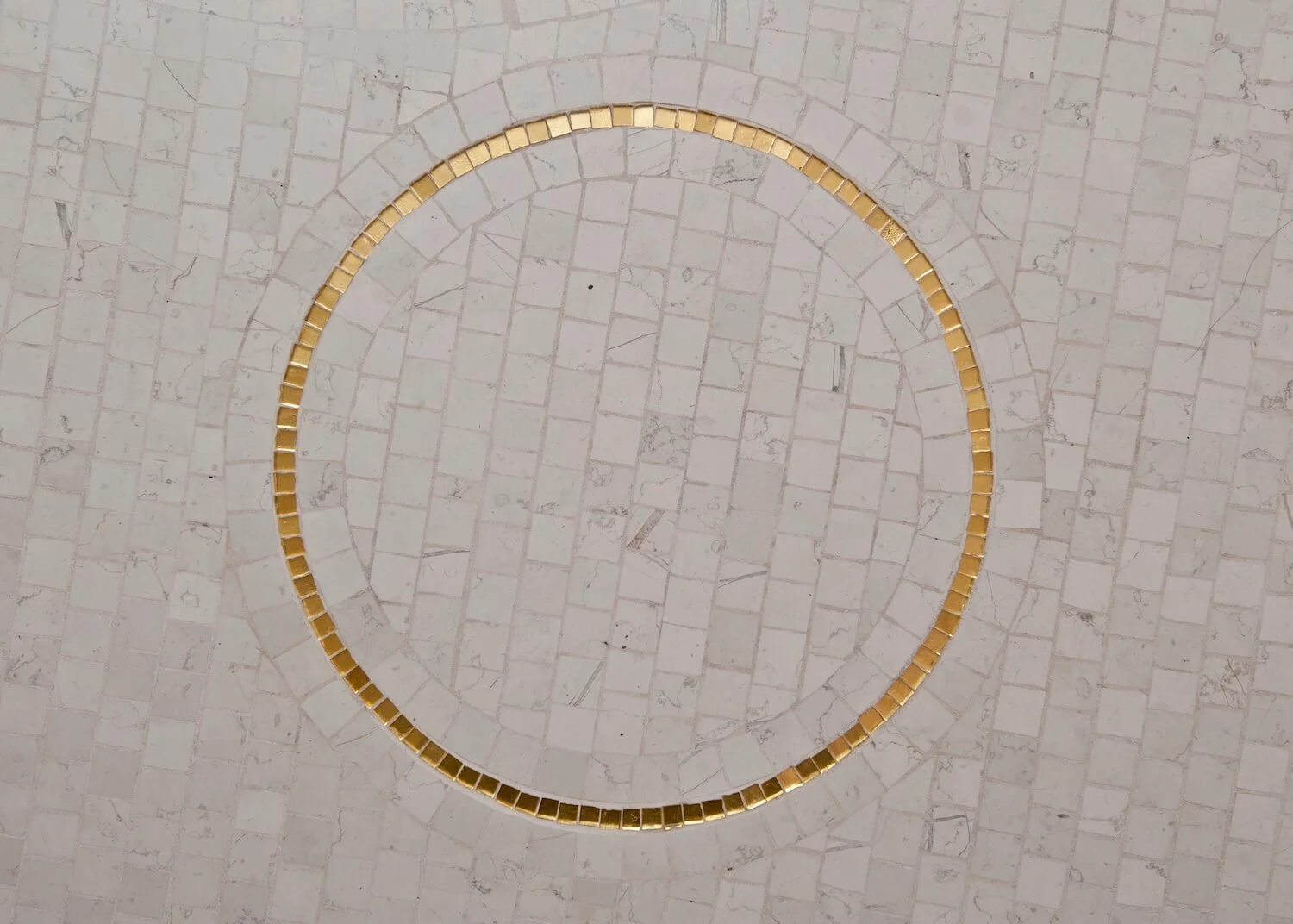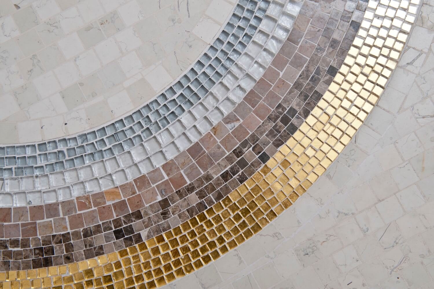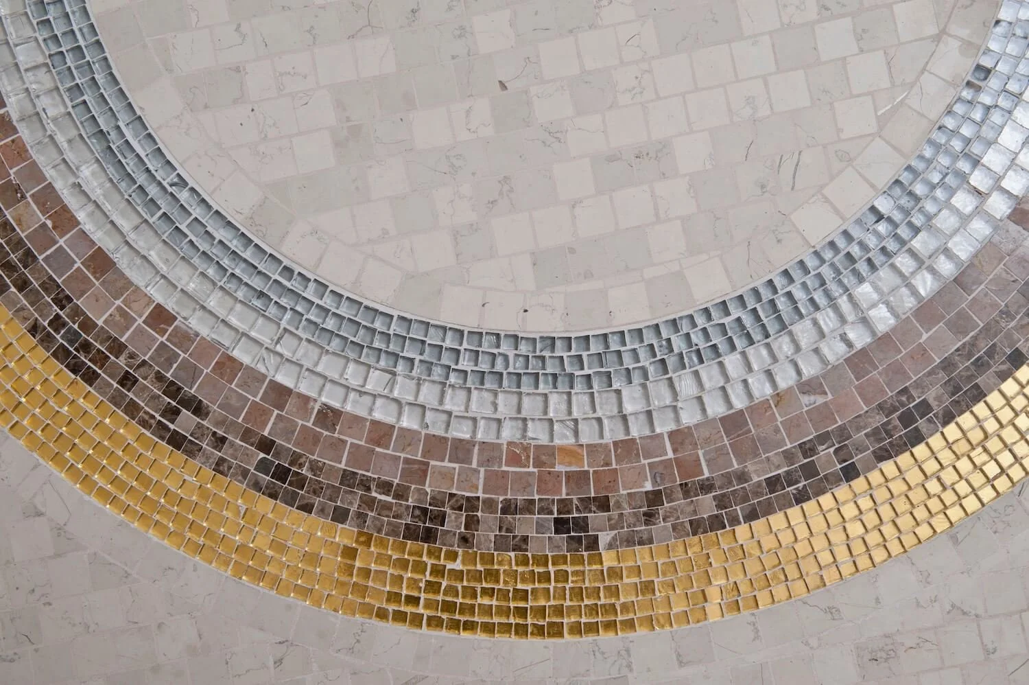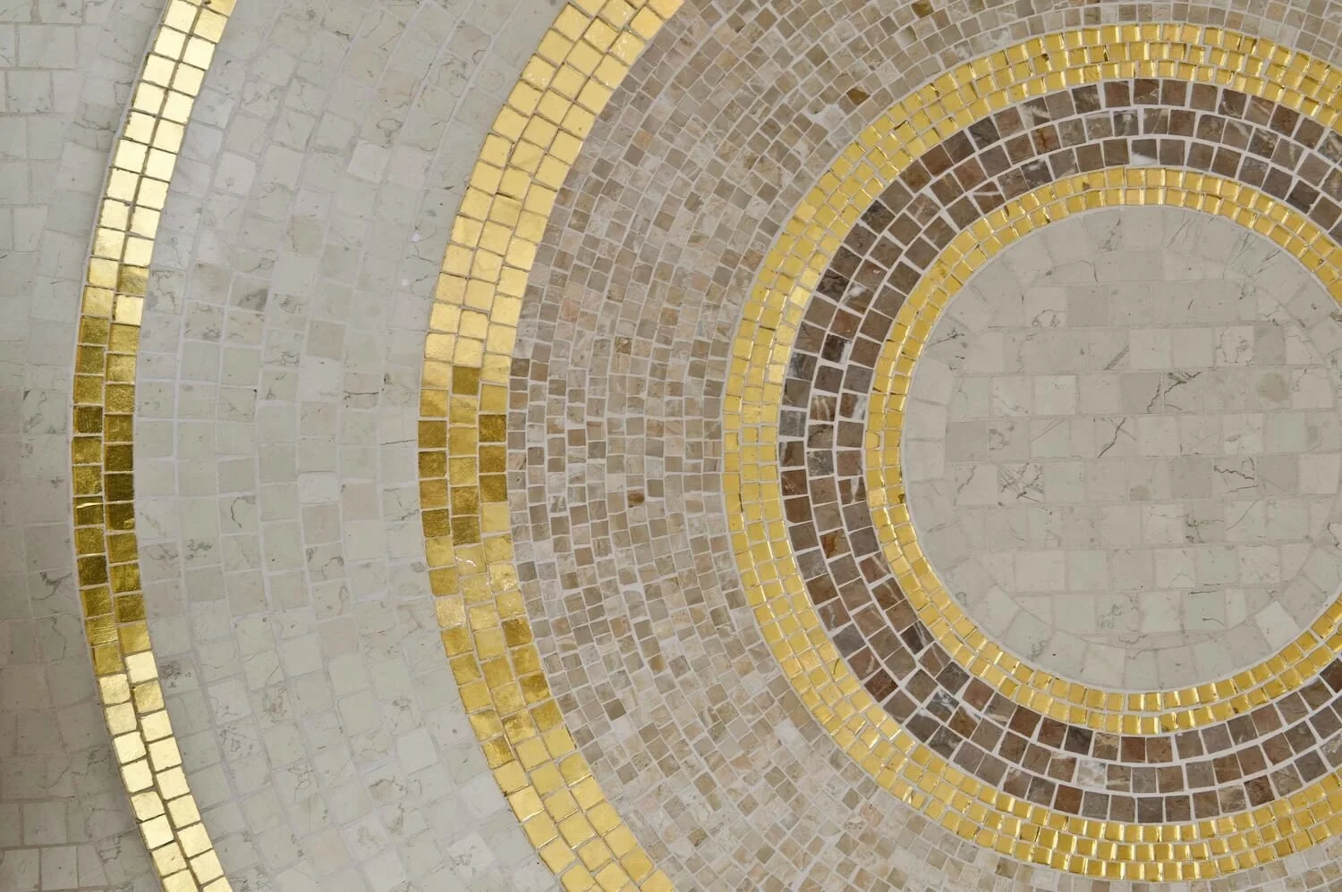 Services: Mosaic-technical planning, fabrication, and installation of 150 m² of mosaic flooring in limestone, glass, and gold mosaic; grinding of selected areas