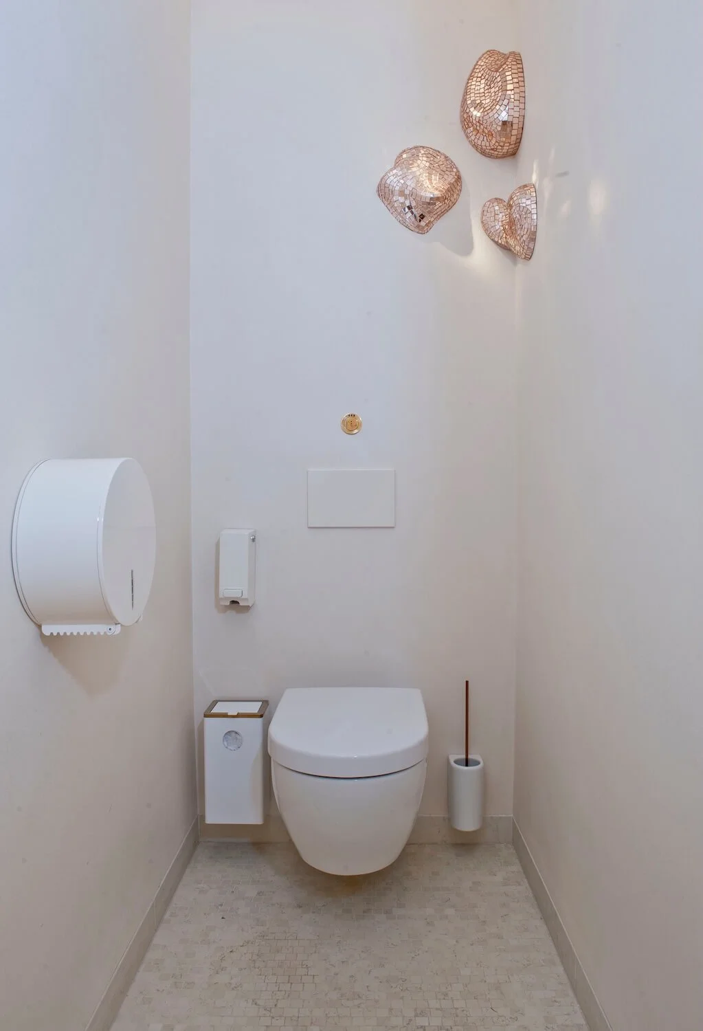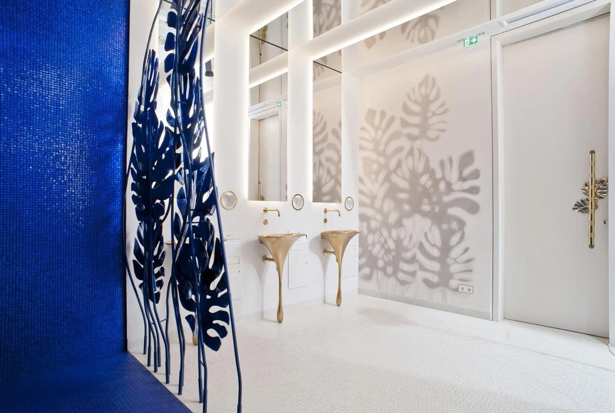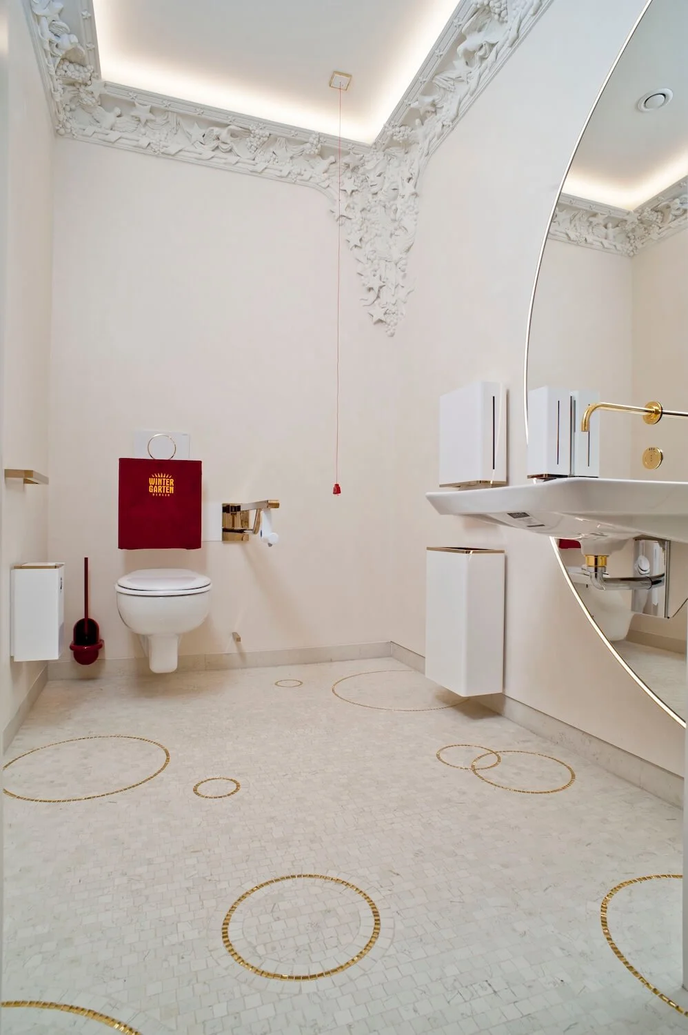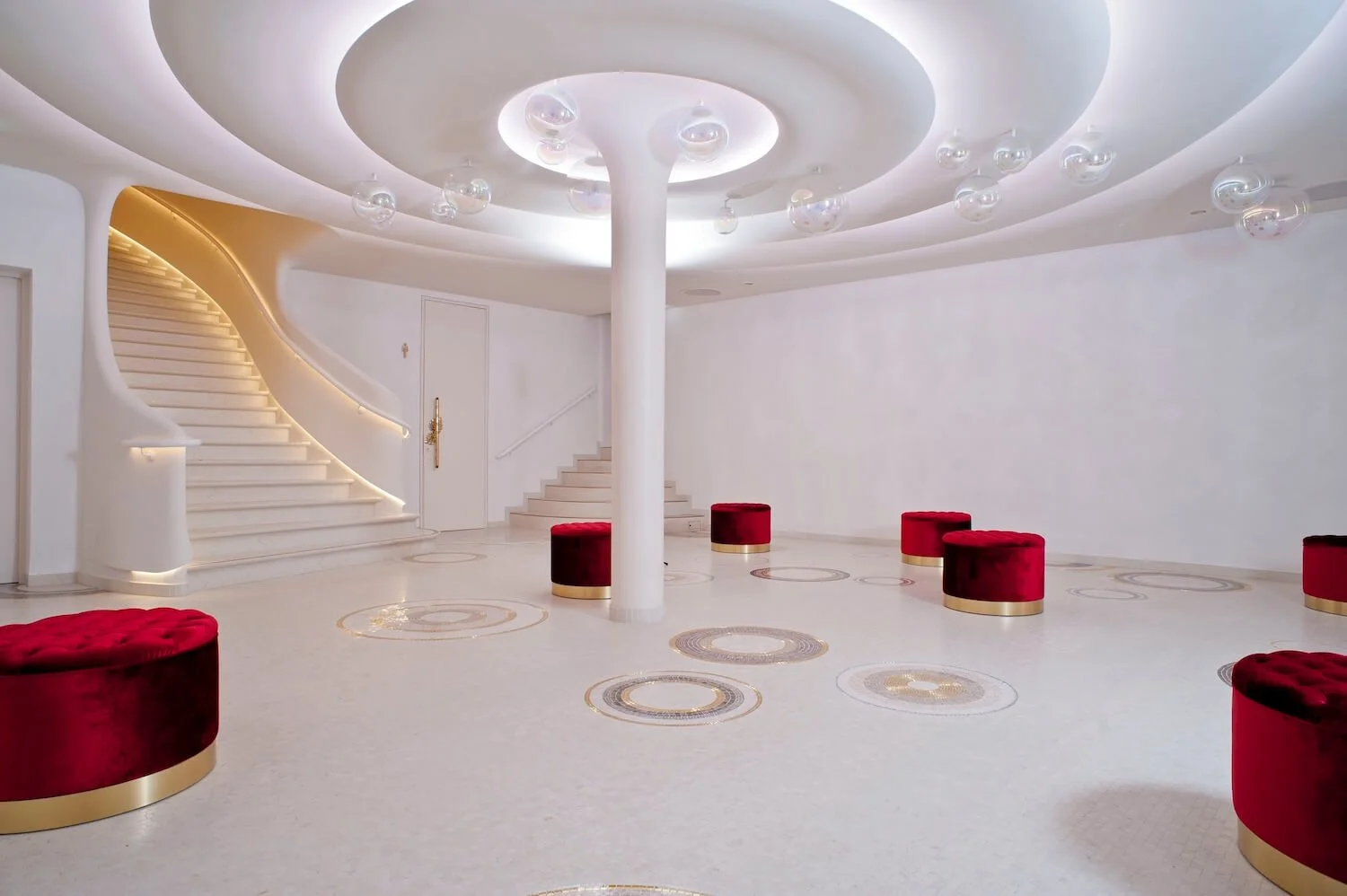 Services: Mosaic-technical planning, fabrication, and installation of 150 m² of mosaic flooring in limestone, glass, and gold mosaic; grinding of selected areas