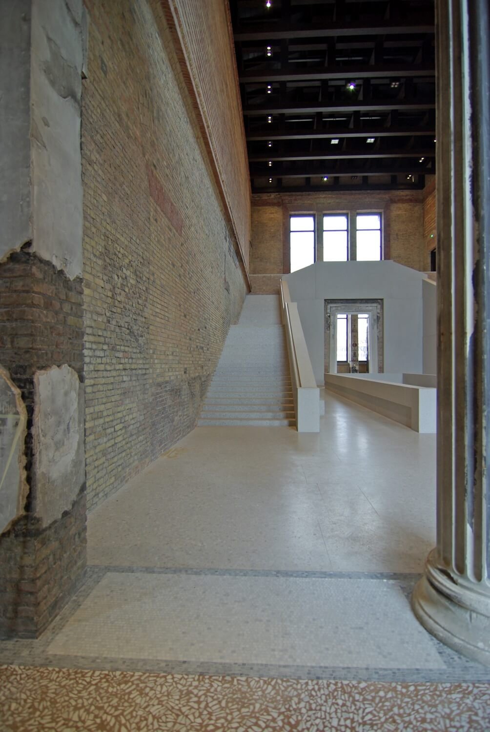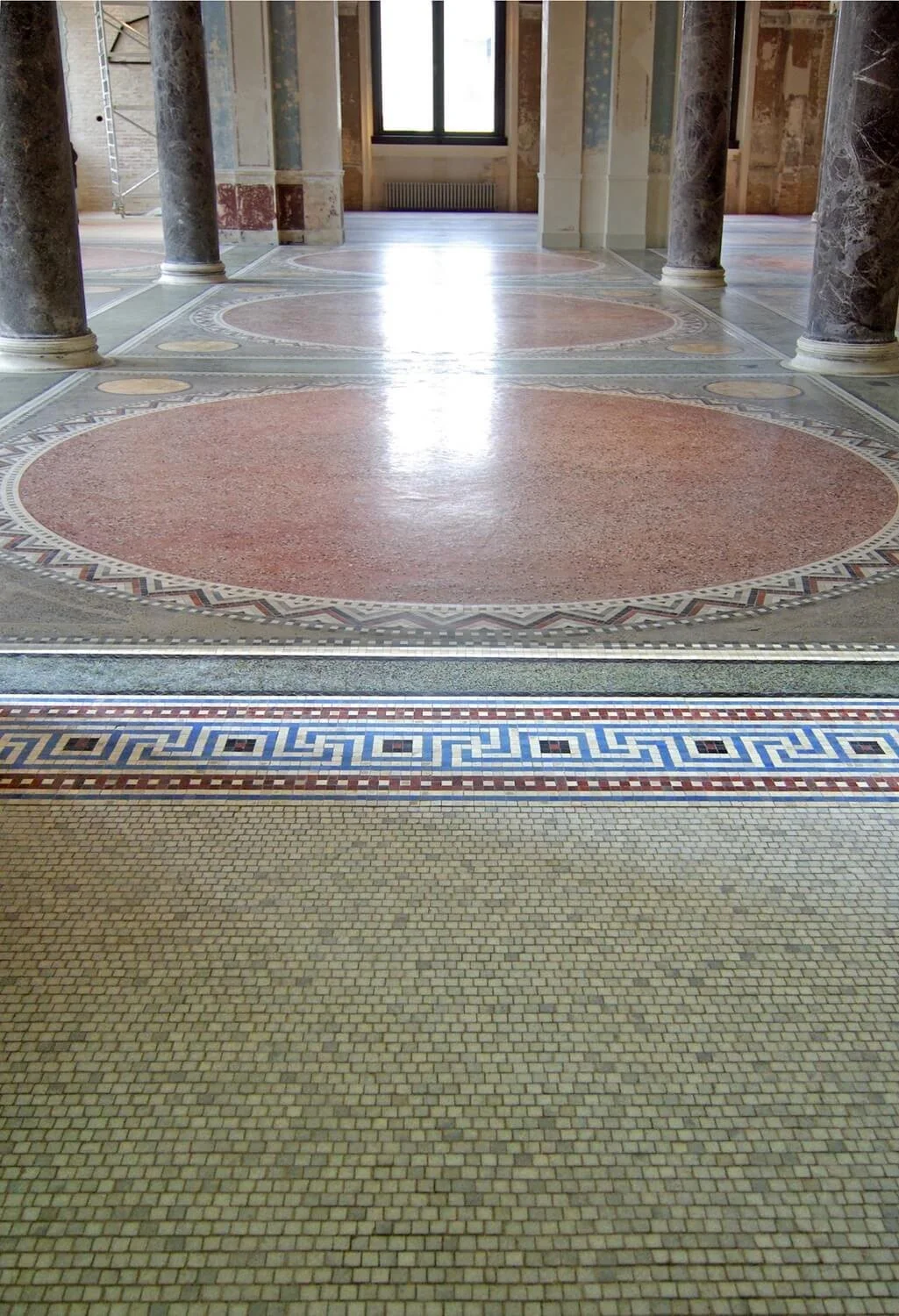 Im Rahmen der umfassenden Sanierung des Neuen Museums auf der Museumsinsel in Berlin fertigten wir circa 200 m² Natursteinmosaik aus schlesischem Marmor in kleineren Teilflächen.