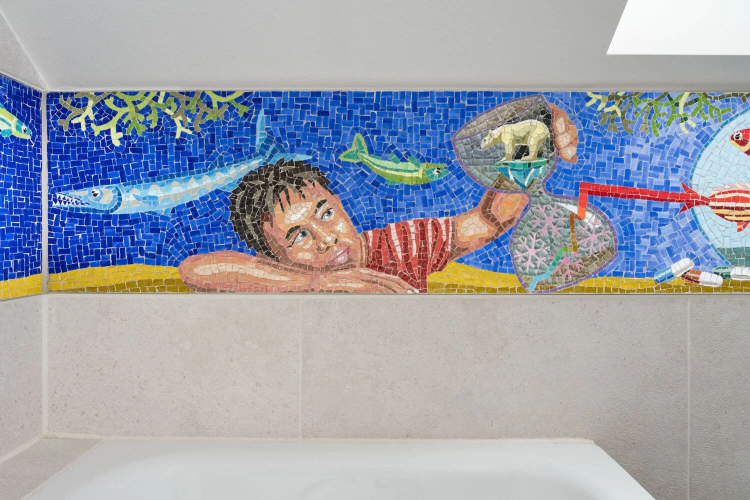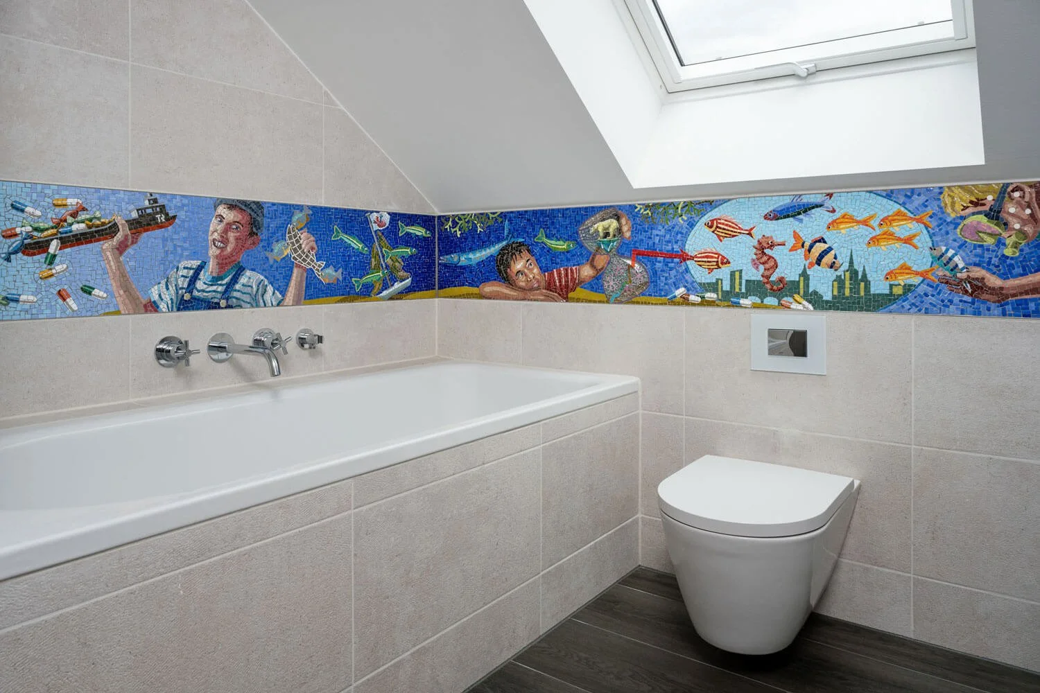 Mosaik-Fries nach einer Grafik des Künstlers Wolf von Waldow für ein Badezimmer in Berlin, 12 m x 0,31 m.